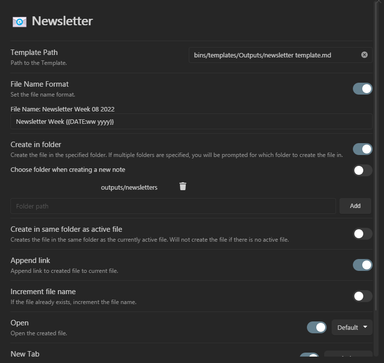 - gives the note a file name of the format “Newsletter Week {{DATE:ww yyyy}}”, which becomes “Newsletter Week 08 2022”, for example